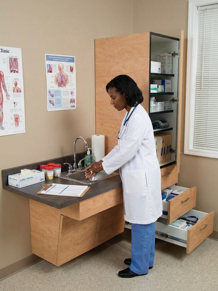 The cabinet shell is constructed from ¾″ thick material for long-term durability. A 23.5″ deep countertop—6″ deeper than typical medical cabinetry—offers expanded workspace while maintaining ADA accessibility.