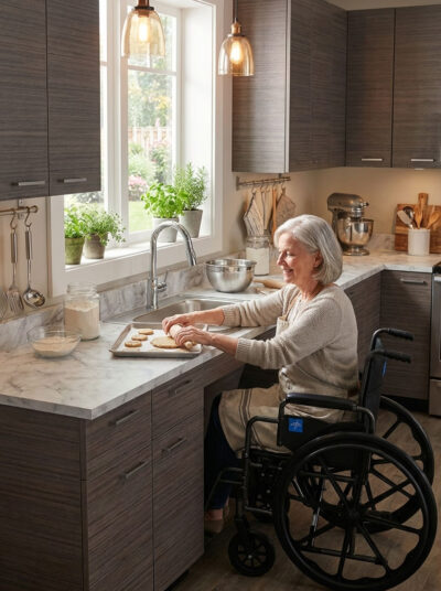 Manufactured using commercial-grade cabinet construction, this ADA compliant kitchen cabinet system provides a durable work surface and long-term performance for demanding environments such as medical offices, clinics, staff kitchens, laboratories, and accessible residential kitchens. The lower ADA countertop height and open access area allow wheelchair users to comfortably approach the workspace while maintaining safe reach ranges and ergonomic usability.