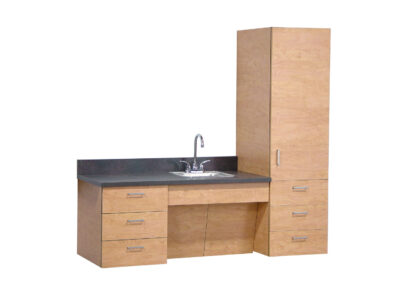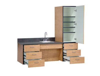 We manufacture Floating medical cabinets with wheelchair access for the facility that needs the cleaning clearance that comes with wall hung base cabinets. High-pressure laminate provides a durable and clean work surface. Cabinet doors open 120 degrees exposing white interior storage with adjustable shelves. . Chrome handles allow easy access to the full extension drawers and ¾” thick doors. Order your Cabinets in any our colors.