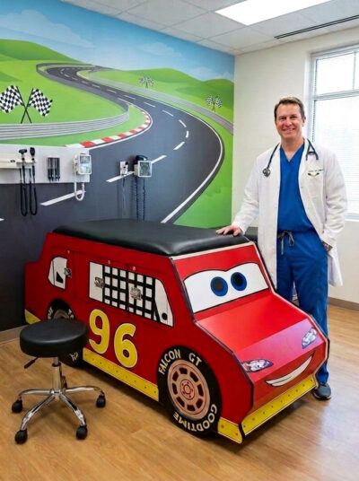 - Race car themed pediatric exam table designed to reduce anxiety and improve patient cooperation